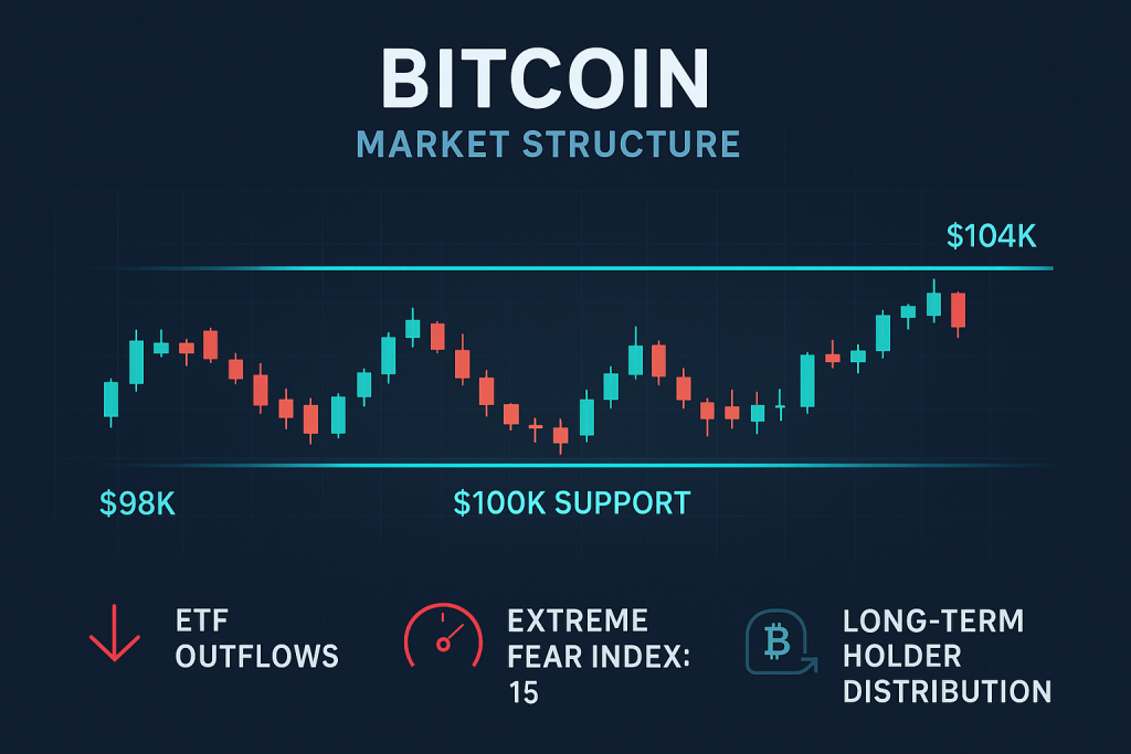 A strong reclaim above $104K could flip momentum bullish; losing $98K exposes a slide toward $94K–$96K.