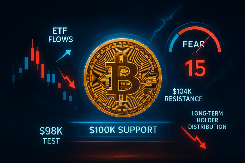 A strong reclaim above $104K could flip momentum bullish; losing $98K exposes a slide toward $94K–$96K.